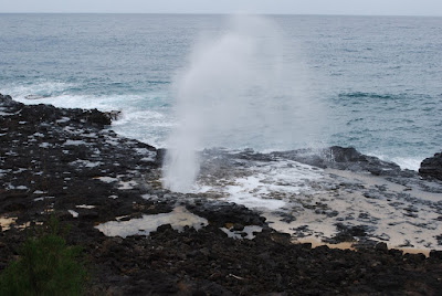 My friend Dianne Draper used to live in Hawaii. She said Spouting Horn was the best place to buy the unique Ni'hau leis made of shells found only on that island west of Kauai. I couldn't afford the lovely leis, but we did get some typical pictures of the spouting horn area. As was so common on our vacation, the rain grays out the pictures a bit.